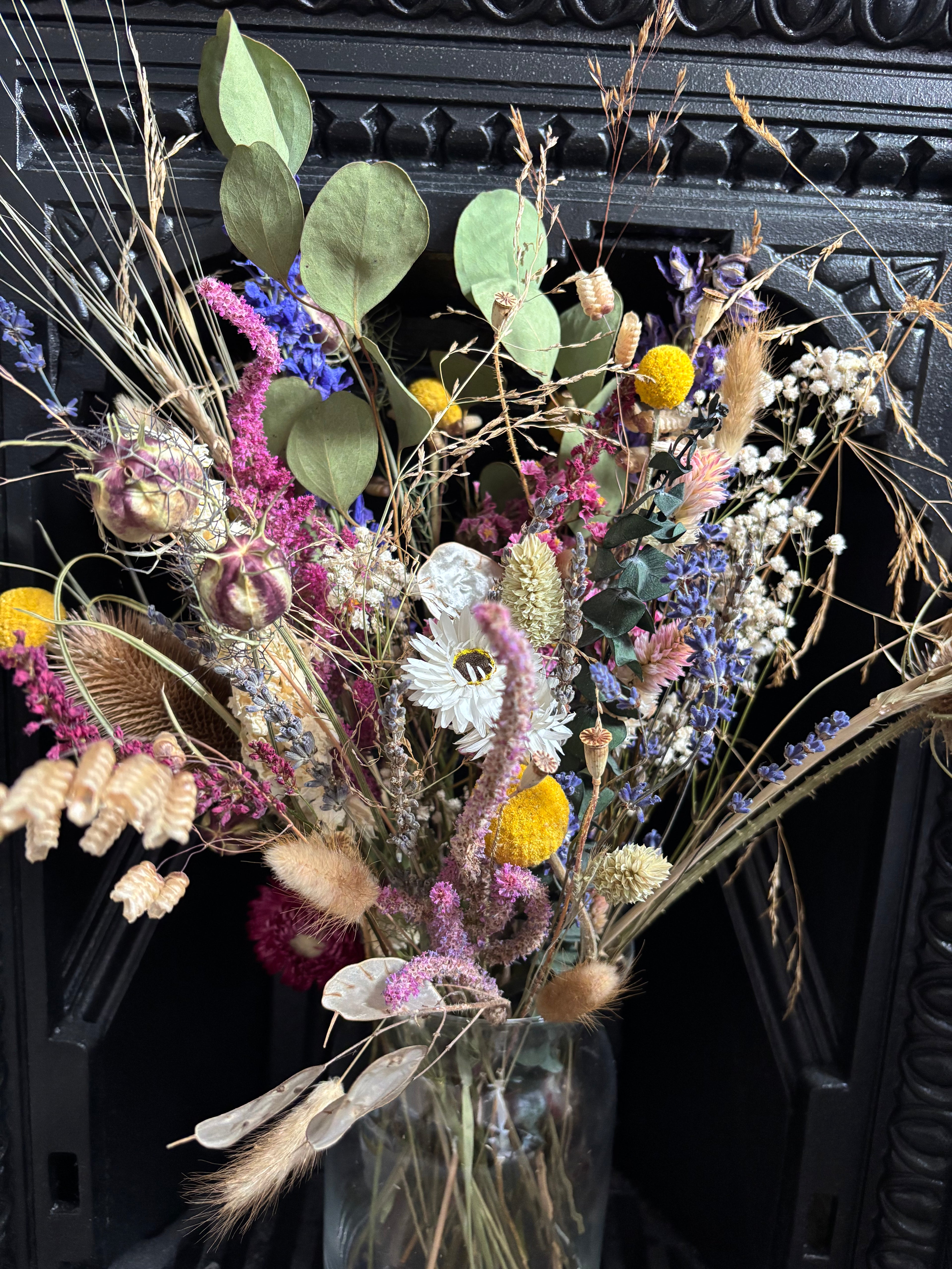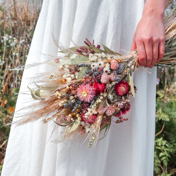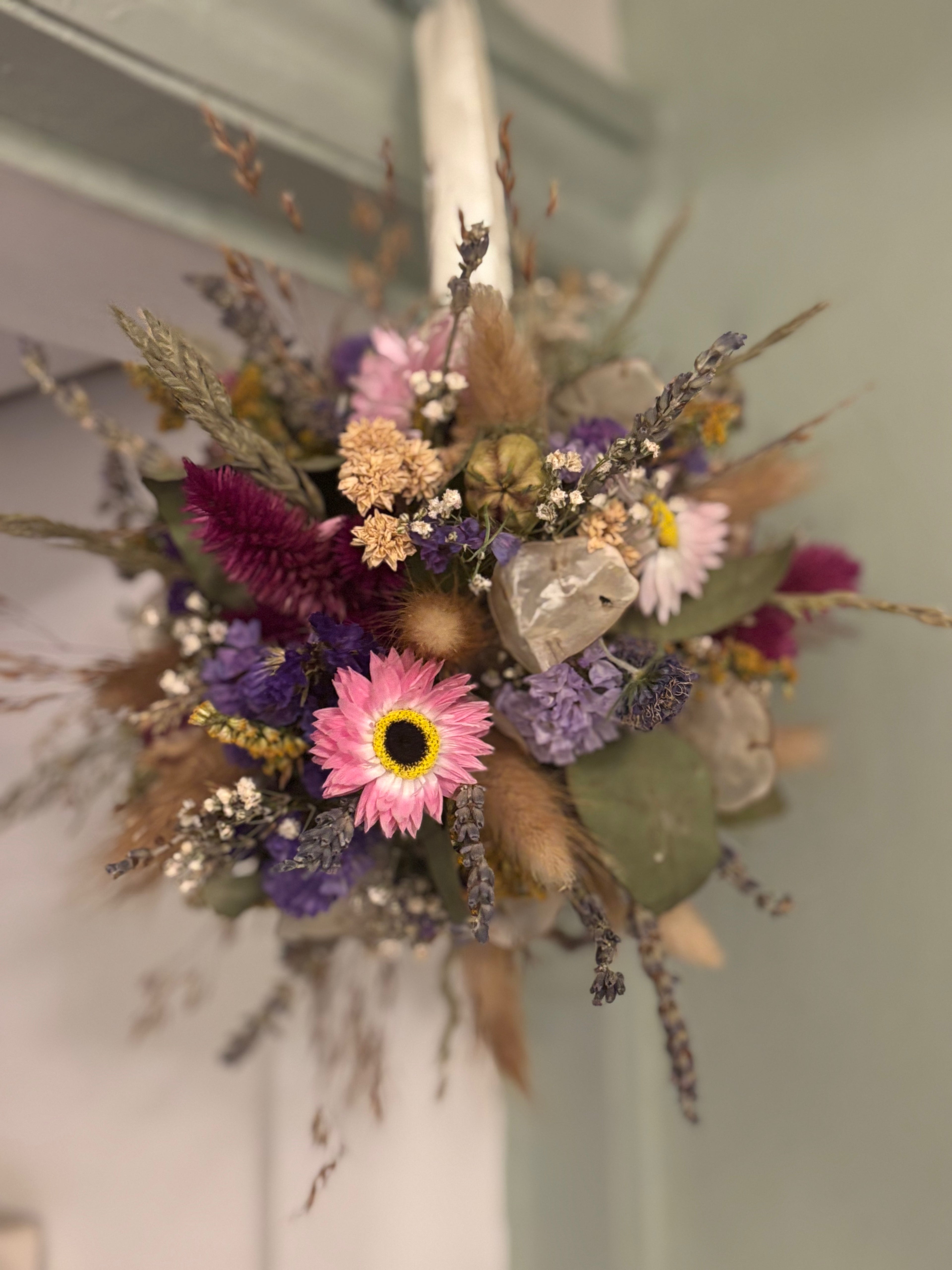 Our flowers are sustainably grown from seed and harvested with care, always putting nature first. We leave many blooms for the pollinators — the true priority — and for the wildlife that shares our space. Every piece is dried naturally and lovingly crafted working with nature, not against it.